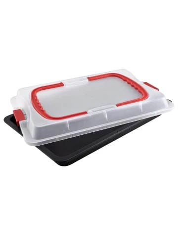 Dr. Oetker Backblech mit Transporthaube BAKE & GO (Menge: 1 Stück)Mit dem Backblech inklusive Transporthaube aus dem Dr. Oetker Sortiment “Bake & Go” aus veredeltem Schwarzblech gelingen Kuchen, Aufläufe und Süßspeisen mit Sicherheit. Die stabile Transporthaube lässt sich direkt am Rand der Form befestigen und ermöglicht einen sicheren Transport der Backwaren. Zudem lassen sich Kuchen und Co. darin aufbewahren und vor dem Austrockenen bewahren. Das langlebige Backblech überzeugt durch seine ausgezeichnete Wärmeleitung, die für gleichmäßige Bräunung der Backwaren sorgt. Die sehr guten Antihaft-Eigenschaften verhindern das Anbrennen der Speisen. Nach der Verwendung kann das Backblech leicht per Hand, die Transporthaube ist kann einfach in der Spülmaschine gereinigt werden. Dr. Oetker gewährt 5 Jahre Qualitätsgarantie auf das Backblech “Made in Germany”.Qualität ist das beste Rezept» Maße: Innenmaße: ca. 39 x 4 x 26 cm, Außenmaße: ca. 42,5 x 7,5 x 29,5 cm» Material: Stahlblech mit Classic Antihaftbeschichtung, Haube aus Kunststoff» Reinigung: Leichte Reinigung per Hand (Form), spülmaschinengeeignet (Haube)Mit Dr. Oetker vertrauen Sie auf ein Familienunternehmen, welches seit über 125 Jahren einen besonderen Umgang mit seinen Verbrauchern pflegt. Alle Dr. Oetker Backformen und Küchenhelfer werden in der Dr. Oetker eigenen Versuchsküche getestet und zertifiziert. Durch langjährige Erfahrung hinsichtlich Qualität und Gelingsicherheit ist auf die Dr. Oetker Küchenhelfer immer Verlass.