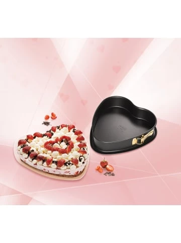 Dr. Oetker Herz-Springform Ø 25 cm BACK FREUDE CLASSIC (Menge: 1 Stück)Die Dr. Oetker Herz-Springform mit Auslaufschutzboden ist ein echtes Multitalent und überzeugt schon optisch mit Design und optimiertem Verschluss in Gold, mit dem traditionellen Dr. Oetker Logo. Der Auslaufschutzboden lässt auch den flüssigsten Teig nicht austreten und durch die besondere Teflon-Antihaft-Beschichtung lösen sich feinste Teige spielend leicht aus der Form. Die tolle Formgebung sorgt für einen optisch gelungenen Kuchen. Die Herz-Springform ist hitzebeständig bis +230°C. Das veredelte Schwarzblech sorgt außerdem für eine gleichmäßige Bräunung des Inhalts und auch das anschließende Reinigen geht schnell und mühelos von der Hand.Qualität ist das beste Rezept» Maße: Ø: 25 cm, Höhe: 7 cm» Material: Stahlblech mit Antihaftbeschichtung» Leichte Reinigung per HandMit Dr. Oetker vertrauen Sie auf ein Familienunternehmen, welches seit über 125 Jahren einen besonderen Umgang mit seinen Verbrauchern pflegt. Alle Dr. Oetker Backformen und Küchenhelfer werden in der Dr. Oetker eigenen Versuchsküche getestet und zertifiziert. Durch langjährige Erfahrung hinsichtlich Qualität und Gelingsicherheit ist auf die Dr. Oetker Küchenhelfer immer Verlass.