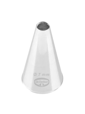 Dr. Oetker Lochtülle 7 mm TÜLLEN-MANUFAKTUR (Menge: 1 Stück)Mit der Lochtülle von Dr. Oetker lassen sich Ihre Backkreationen mit tupfen-, perlen- oder seilförmigen Borten verzieren und individualisieren. Die smarte Tülle aus hochwertigem Edelstahl mit einem Tüllenöffnungs-Durchmesser von sieben Millimetern ist aus einem Stück gezogen und somit nahtfrei. Sie kann sowohl mit als auch ohne den praktischen Universaladapter (Artikelnr. #3503) verwendet und nach dem Gebrauch zum Reinigen in die Spülmaschine gegeben werden. Die Lochtülle kann zudem für Schokoladenornamente oder Spritzglasur, sogenanntes Icing, eingesetzt werden.Eigenschaften:– Maße ca.: 2,5 x 4,5 x 2,5 cm– Perfekt zum Verzieren und Dekorieren– passend mit und ohne Universaladapter– SpülmaschinengeeignetMit Dr. Oetker vertrauen Sie auf ein Familienunternehmen, welches seit über 125 Jahren einen besonderen Umgang mit seinen Verbrauchern pflegt. Alle Dr. Oetker Backformen und Küchenhelfer werden in der Dr. Oetker eigenen Versuchsküche getestet und zertifiziert. Durch langjährige Erfahrung hinsichtlich Qualität und Gelingsicherheit ist auf die Dr. Oetker Küchenhelfer immer Verlass.
