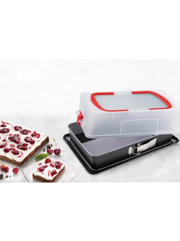 Dr. Oetker Rechteck-Springform mit Emaille-Boden und Haube BACK-IDEE KREATIV (Menge: 1 Stück)Die Rechteck-Springform mit Emaille-Servierboden und Transporthaube aus dem Dr. Oetker Sortiment “Back-Idee Kreativ” mit den Innenmaßen 38 x 7 x 25 Zentimeter ist perfekt geeignet für mehrschichtige Kuchen aller Art. Die stabile und hohe Transporthaube lässt sich direkt am Rand der Form befestigen und ermöglicht einen sicheren Transport der Backwaren. Zudem lässt sich Kuchen darin gut aufbewahren und ist vor dem Austrocknen geschützt. Dank der glasglatten, schnitt- und kratzfesten Quarz-Emaille-Versiegelung des Servierbodens kann der Kuchen direkt in der Form geteilt werden. Der grau-schwarze Springform-Ring aus Stahlblech Special Antihaft-Beschichtung verhindert das Anbrennen der Speisen und ermöglicht das einfache Entformen des Kuchens. Die Rechteck-Springform liefert sehr gute Backergebnisse durch eine ausgezeichnete Wärmeleitung. Sie ist auslaufsicher und hitzebeständig bis 230°C. Der emaillierte Servierboden kann zum Reinigen in die Spülmaschine gegeben werden und den Springform-Ring leicht per Hand reinigen. Dr. Oetker gewährt 10 Jahre Qualitätsgarantie auf diese Springform “Made in Germany”.Die Welt des Backens» Maße: Innenmaße: ca. 38 x 7 x 25 cm, Außenmaße: ca. 44 x 10 x 29,5 cm» Material: Stahlblech mit Emaille-Versiegelung (Boden), Stahlblech mit Antihaftbeschichtung (Ring)» Reinigung: Spülmaschinengeeignet (Boden), leichte Reinigung per Hand (Ring)Mit Dr. Oetker vertrauen Sie auf ein Familienunternehmen, welches seit über 125 Jahren einen besonderen Umgang mit seinen Verbrauchern pflegt. Alle Dr. Oetker Backformen und Küchenhelfer werden in der Dr. Oetker eigenen Versuchsküche getestet und zertifiziert. Durch langjährige Erfahrung hinsichtlich Qualität und Gelingsicherheit ist auf die Dr. Oetker Küchenhelfer immer Verlass.