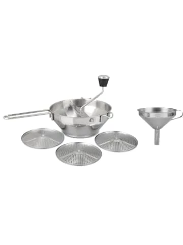 Dr. Oetker Passiergerät mit Trichter (Menge: 1 x 5er Set)Abgedreht! Mit der Passiermühle aus hochwertigem, rostfreiem Edelstahl von Dr. Oetker können Sie Obst, Gemüse und Früchte spielend leicht passieren und so samtige Konfitüre, feines Fruchtmus oder auch Pürees, Suppen, Saucen und Babynahrung selbst herstellen. Dank der drei unterschiedlich gelochten Scheiben (1 mm, 2 mm, 3 mm Lochung) können die Lebensmittel je nach Bedarf fein, mittel oder grob passiert werden. Das Passiergerät hat ein Füllvolumen von bis zu einem Liter und liegt durch die beiden Griffe bequem und stabil auf jedem Topf mit einem Durchmesser von bis zu 28 Zentimetern auf. Durch die schmale Öffnung gelingt es mit dem Dr. Oetker Trichter jede beliebige Flasche ohne kleckern zu befüllen. Die Siebscheibe verhindert das durchrutschen von großen Früchten, Beeren usw. und kann bei belieben auch herausgenommen werden. Nach der Verwendung können die Passiermaschine und der Trichter ganz einfach in der Spülmaschine gereinigt werden und ist sofort bereit für den nächsten Einsatz.Qualität ist das beste Rezept» Maße: Passiergerät: Ø: 19 cm, Länge: 32 cm, Höhe: 8 cm Trichter: 12 x 11,5 x 1,5 cm» Multifunktional verwendbar für Brei, Soßen, Suppen und Vieles mehr» Inklusive drei verschieden starken Locheinsätzen Mit Dr. Oetker vertrauen Sie auf ein Familienunternehmen, welches seit über 125 Jahren einen besonderen Umgang mit seinen Verbrauchern pflegt. Alle Dr. Oetker Backformen und Küchenhelfer werden in der Dr. Oetker eigenen Versuchsküche getestet und zertifiziert. Durch langjährige Erfahrung hinsichtlich Qualität und Gelingsicherheit ist auf die Dr. Oetker Küchenhelfer immer Verlass.